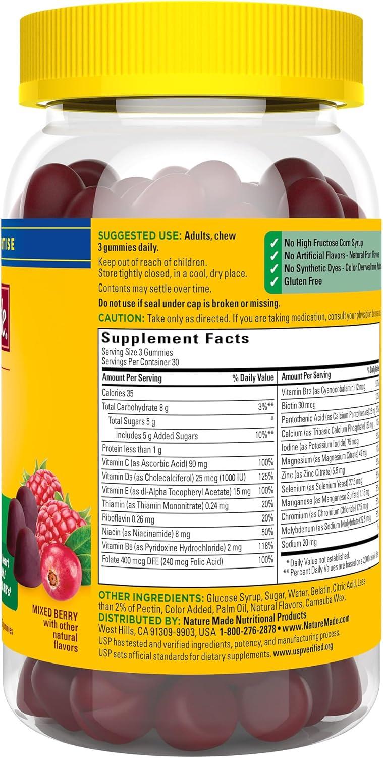 Nature Made Advanced Multi for Adults Gummies provide 20 key nutrients for daily nutritional support. It’s both a womens multivitamin and a mens multivitamin, providing 60% more total nutrients(1) in tasty gummies plus a good source of Magnesium Citrate and Calcium and an excellent source of all 8 B Vitamins. This adult multivitamin provides nutrients to support brain, heart and immune function, bone and muscle health, and energy metabolism (2). These daily vitamin gummies are gluten free with no artificial flavors, no high fructose corn syrup, and no synthetic dyes – color derived from natural source. These gummy vitamins for women & vitamins for men are in a tasty mixed berry with other natural flavors. Adults, chew 3 gummy vitamins for men and women daily. Start your day with womens vitamins and mens vitamins from Nature Made. Explore vitamins and supplements from Nature Made, including women's and men’s vitamins and daily vitamins. (1) As compared to Nature Made Multi Gummies (2) Helps convert food into cellular energy. These statements have not been evaluated by the Food and Drug Administration. This product is not intended to diagnose, treat, cure, or prevent any disease.