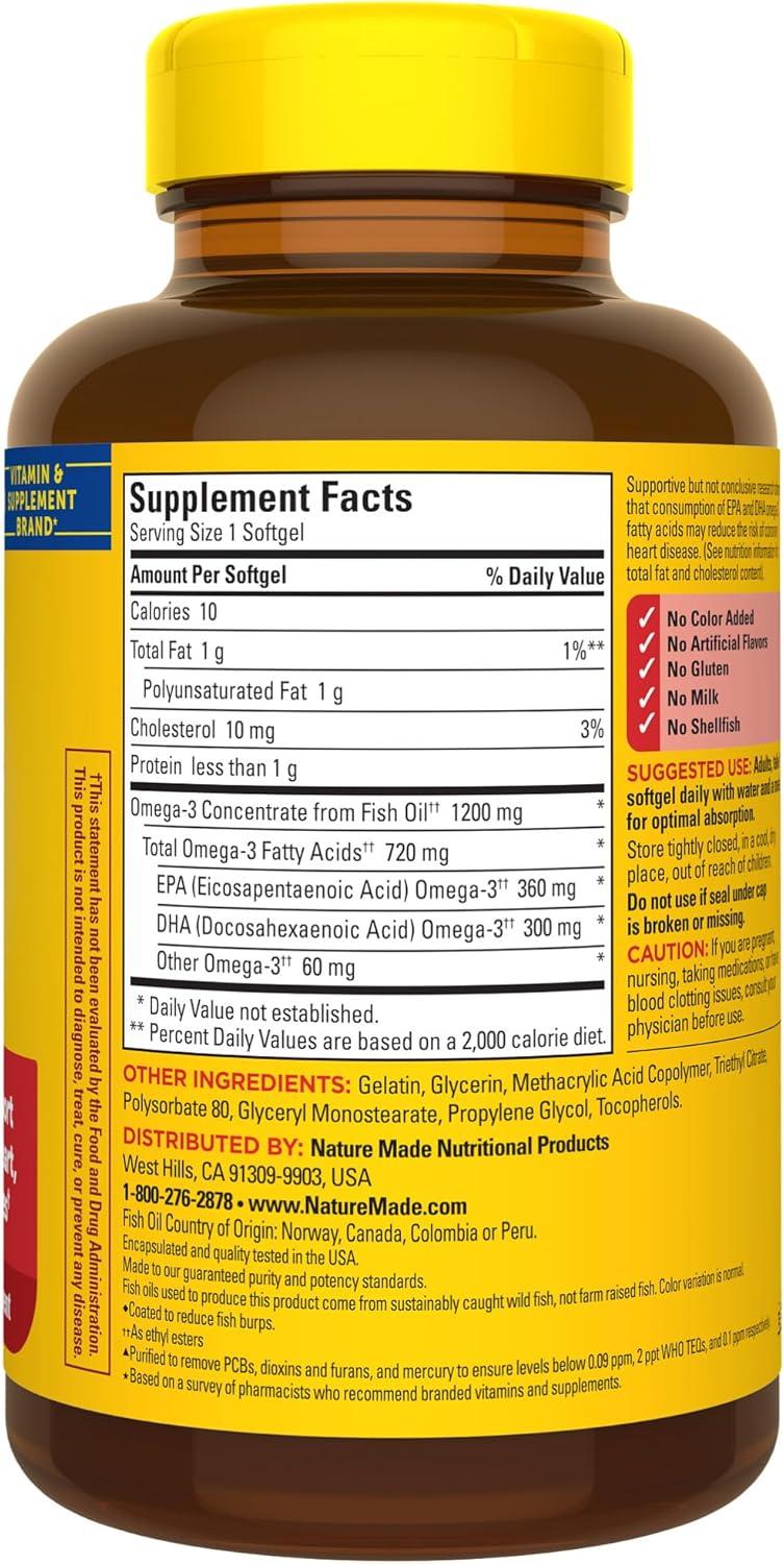 Nature Made Burp Less Fish Oil Omega 3 Supplements, 1200 mg Softgels, Omega 3 Fish Oil for Healthy Heart Support, 300 Softgels, 150 Day Supply(120 Count (Pack of 1))