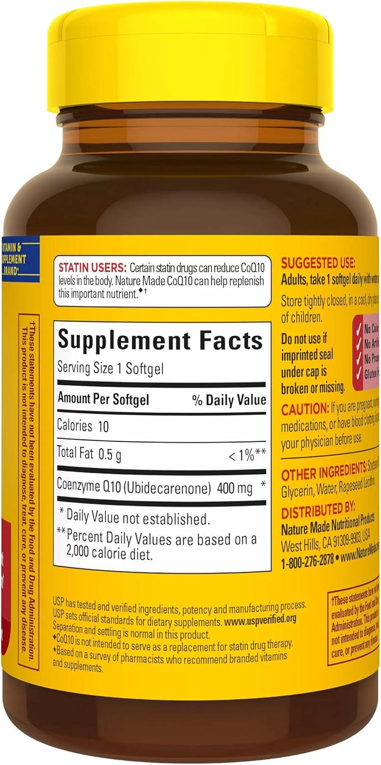 CoQ10 supplements: Nature Made Co Q 10 400 mg dietary supplement provides antioxidant support to fight free radicals and support heart health. These gluten free CoQ10 supplements softgels have no artificial flavors, no preservatives, and no color added – CoQ10 is naturally orange in color. This antioxidant supplement also provides energy metabolism support (1). This Co Q 10 supplement may be important for people taking cholesterol-lowering statin drugs, which can inhibit CoQ10 production in the body. Nature Made CoQ10 400mg softgels can help replenish this important nutrient (2). In addition, CoQ10 levels decrease with age. Adults, take one of these Coenzyme Q10 supplement softgels daily with water and a meal. This daily dietary CoQ10 supplement is made for adults to take by mouth with water at home or on the go and fits perfectly into any supplement user’s routine. USP has tested and verified ingredients, potency and manufacturing process. USP sets official standards for dietary supplements. Visit the USP verified website for more information. (1)Helps convert food into cellular energy. (2)CoQ10 is not intended to serve as a replacement for statin drug therapy. *Based on a survey of pharmacists who recommend branded vitamins and supplements.