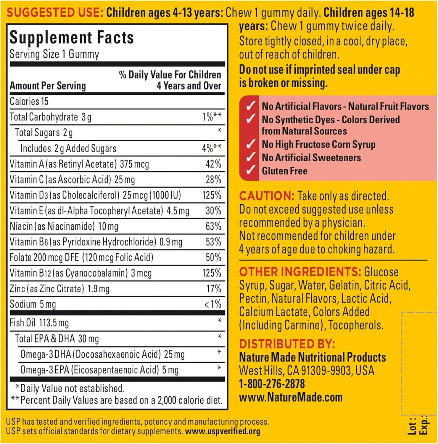 Nature Made Kids Vitamins and Minerals with Omega-3 Gummies are delicious dietary supplements that give growing children the daily nutritional support they need. Sourced from high-quality ingredients, these gluten free multivitamin with omega 3 gummies have no artificial flavors, no synthetic dyes, no high fructose corn syrup, and no artificial sweeteners. These kids omega-3 multivitamin gummies are formulated with essential immune support nutrients and also contain heart-healthy EPA and DHA Omega-3s. Each serving of this kids multivitamin dietary supplement provides 30 mg of EPA and DHA Omega-3 fatty acids. Available in strawberry, lemon and orange with other natural flavors, this children's multivitamin offers a tasty way for your kids to fill nutritional gaps in their diet. Children ages 4-13 chew one of these Nature Made multivitamin gummies daily, and children ages 14-18 chew one of these kids multivitamin gummy dietary supplements twice daily. Nature Made supplements are quality you can trust. Explore vitamins and supplements from Nature Made, including kids gummies and kids gummy vitamins. USP has tested and verified ingredients, potency and manufacturing process. USP sets official standards for dietary supplements. Visit the USP verified website for more information.