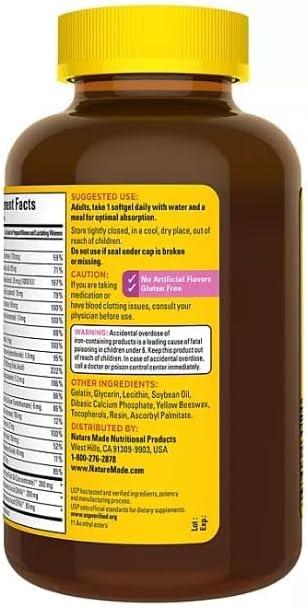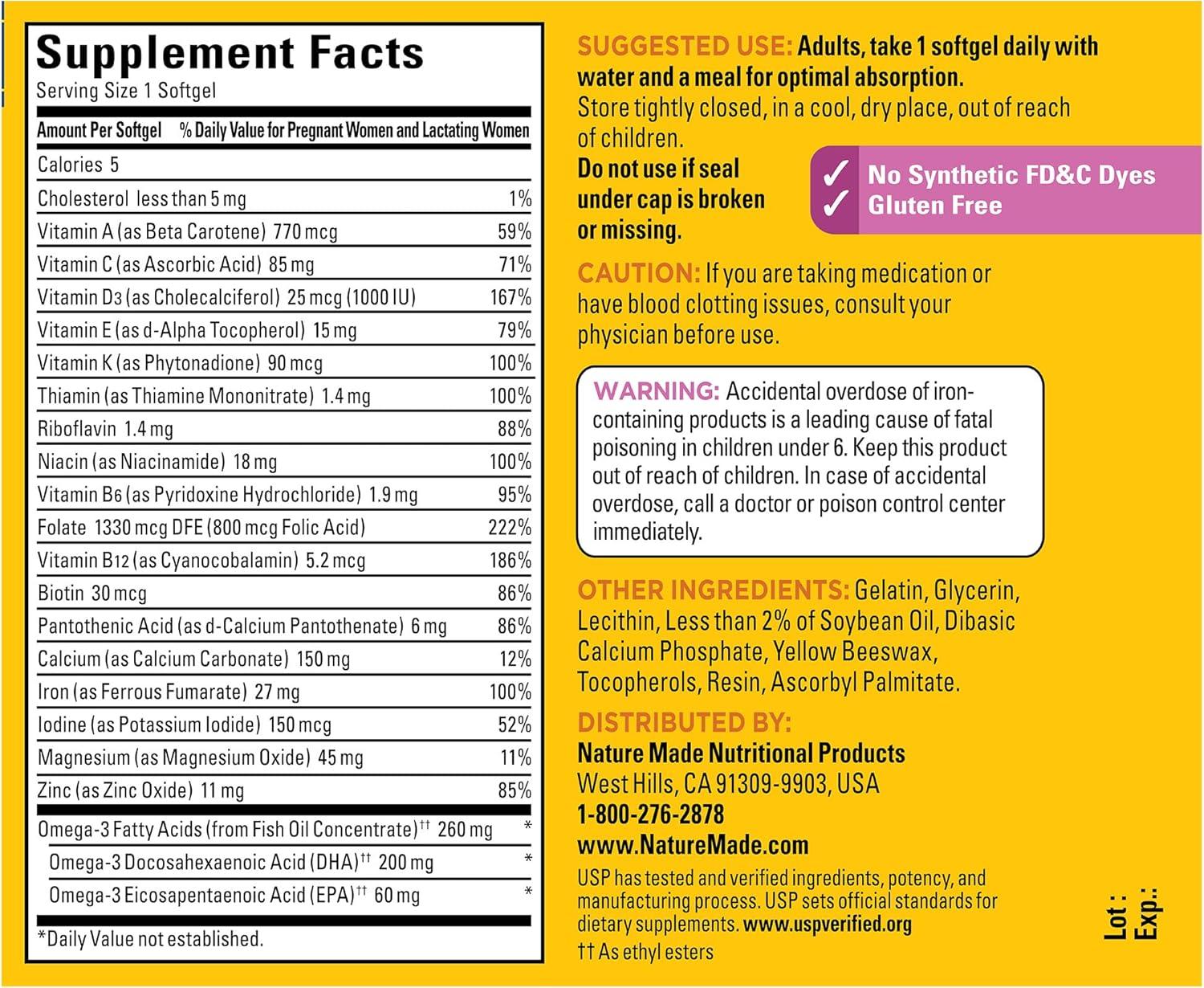 Nature Made Prenatal with Folic Acid and DHA Softgels are prenatal multivitamins specially formulated to support the development of a baby’s brain, nervous system, bones, and eyes while also supporting mom's health. Sourced from high-quality ingredients, this gluten free multivitamin for women is a dietary supplement that contains no synthetic FD&C dyes. This Nature Made Prenatal multivitamin supplement for women contains Folic Acid and 19 other nutrients, and it also includes 200 mg DHA, an Omega-3 for baby's development and mom's health. Nature Made Prenatal with Folic Acid + DHA Softgels also contain all eight B Vitamins and Vitamin A, Vitamin C, Vitamin D, Vitamin E, and Vitamin K. This Nature Made women's multivitamin prenatal with DHA supplement also has clinically proven absorption of Folic Acid and Iron. Adults take one of these prenatal supplement softgels daily with water and a meal for optimal absorption. Start your day with Nature Made supplements. USP has tested and verified ingredients, potency and manufacturing process. USP sets official standards for dietary supplements. Visit the USP verified website for more information. (1) Circana Panel data, Total US – All Outlets for 52 weeks ending Dec-23-2023.