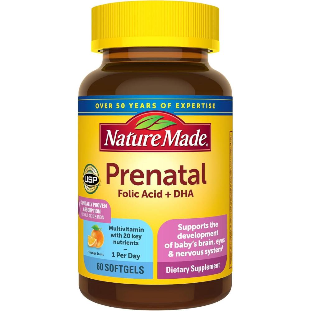 Nature Made Prenatal with Folic Acid + DHA, Prenatal Vitamin and Mineral Supplement for Daily Nutritional Support, 60 Softgels, 60 Day Supply(Unflavored)