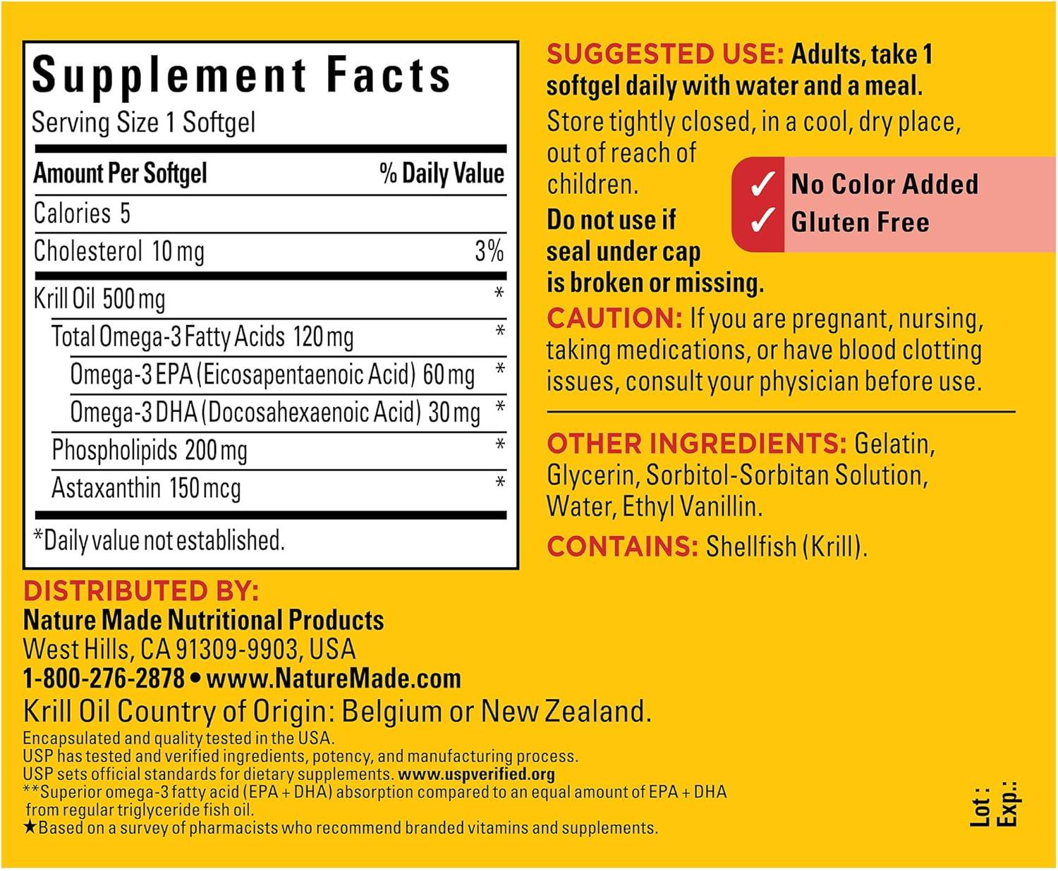 Nature Made Superior Absorption(1) Krill Oil 500mg with Astaxanthin softgels help support a healthy heart. One softgel provides 500mg of Krill Oil, including 120 mg of total Omega-3 fatty acids, with 60 mg EPA and 30 mg DHA per serving. This Antarctic Krill Oil supplement is not fish oil from fish, it is sourced from krill, small shrimp-like crustacean shellfish found in the Antarctic Ocean. Krill Oil is bound to phospholipids, making it easier to absorb than fish oil bound to triglycerides(1). This EPA DHA Omega 3 supplement is gluten free with no color added. This Omega 3 supplement for women and men is made to take by mouth with water at home or on the go and fits perfectly into any supplement user’s routine. These krill oil supplements for women and men include both EPA DHA to support heart health. USP has tested and verified ingredients, potency and manufacturing process. USP sets official standards for dietary supplements. Visit the USP verified website for more information. (1)Superior omega-3 fatty acid (EPA + DHA) absorption compared to equal amount of EPA + DHA from regular triglyceride fish oil. *Based on a survey of pharmacists who recommend branded vitamins and supplements.