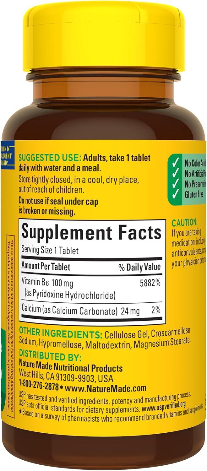 Nature Made Vitamin B6 100mg, B6 Vitamins for Energy Metabolism Support, 100 Tablets, 100 Day Supply(Unflavored)