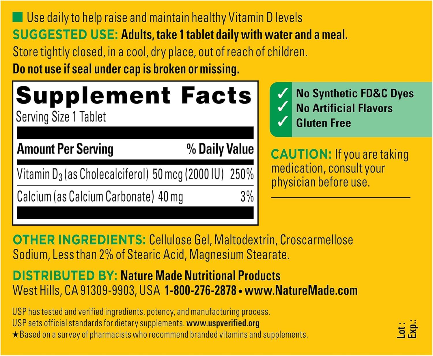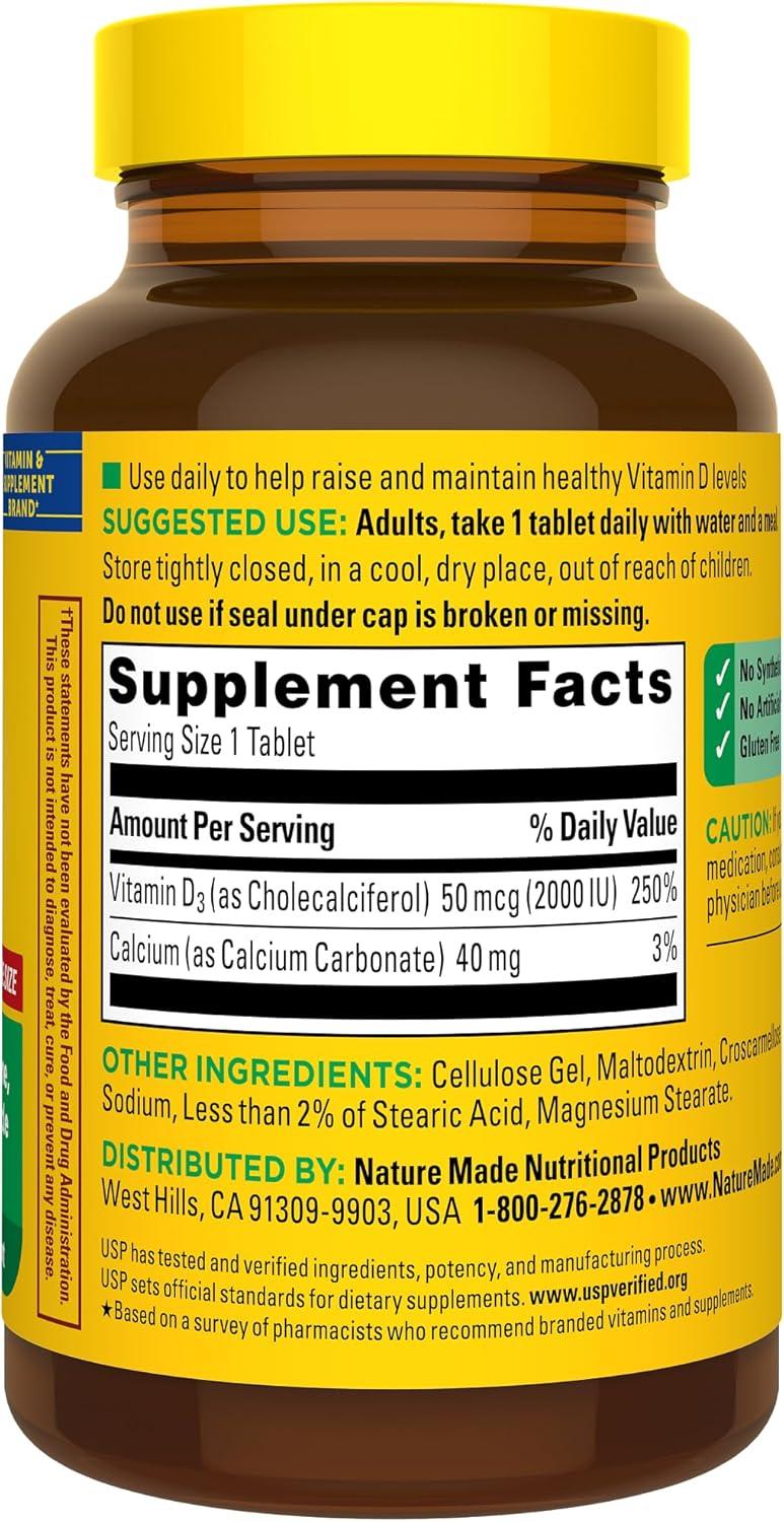 Nature Made D3 Vitamin 2000 IU Tablets (50 mcg) offer an easy way to add Vitamin D supplements for women and men to your daily routine to support bone, teeth and muscle health. Sourced from high quality ingredients, these Nature Made Vitamin D tablets are gluten free dietary supplements with no color added and no artificial flavors. Each Vitamin D3 2000IU tablet supports a healthy immune response and aids in calcium absorption. Vitamin D is a common nutrient shortfall. D3 vitamin is the body’s preferred form of Vitamin D to help maintain Vit D levels. These Nature Made Vitamin D3 supplements contain 50mcg (2000 IU) of Vit D3 per serving. Adults, take one Vitamin D3 Nature Made tablet daily with water and a meal. This Nature Made D3 2000 IU supplement is quality you can trust. USP has tested and verified ingredients, potency and manufacturing process. USP sets official standards for dietary supplements. Visit the USP verified website for more information. *Based on a survey of pharmacists who recommend branded vitamins and supplements. These statements have not been evaluated by the Food and Drug Administration. This product is not intended to diagnose, treat, cure or prevent any disease.