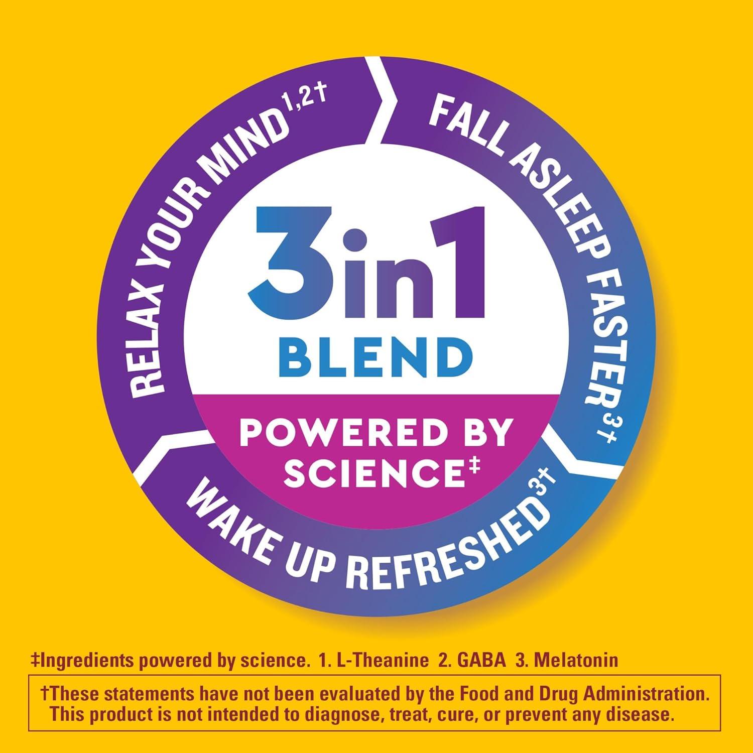 Nature Made Wellblends Back To Sleep provides 3 benefits in 1 blend for sleep support. This 100% drug-free occasional use sleep aid combines lower dose Melatonin 1mg (2) with a blend of GABA 100 mg and L-theanine 100 mg. Support for a calm and relaxed mental state can be found in GABA supplements like these that also contain L-theanine to help you unwind by relaxing your mind before bedtime. Melatonin helps you fall asleep faster and wake up refreshed. All this support in just one easy, sugar free Melatonin (3) fast dissolve tablet you can take without water. Adults, take 1 fast dissolve tablet 30 minutes before bedtime to help fall asleep or upon waking in the middle of the night. Dissolve in mouth or chew before swallowing. Take at least 4 hours before waking. Comes in delicious Berry flavor with other natural flavors. For other sleep supplements, try our Nature Made sleep aids for adults extra strength and more. (1)Ingredients powered by science (2)Compared to Nature Made Wellblends Melatonin products (3)Not a low calorie food (4)Melatonin helps you fall asleep faster and wake up refreshed *Based on a 2022 survey of pharmacists who recommend branded vitamins and supplements.