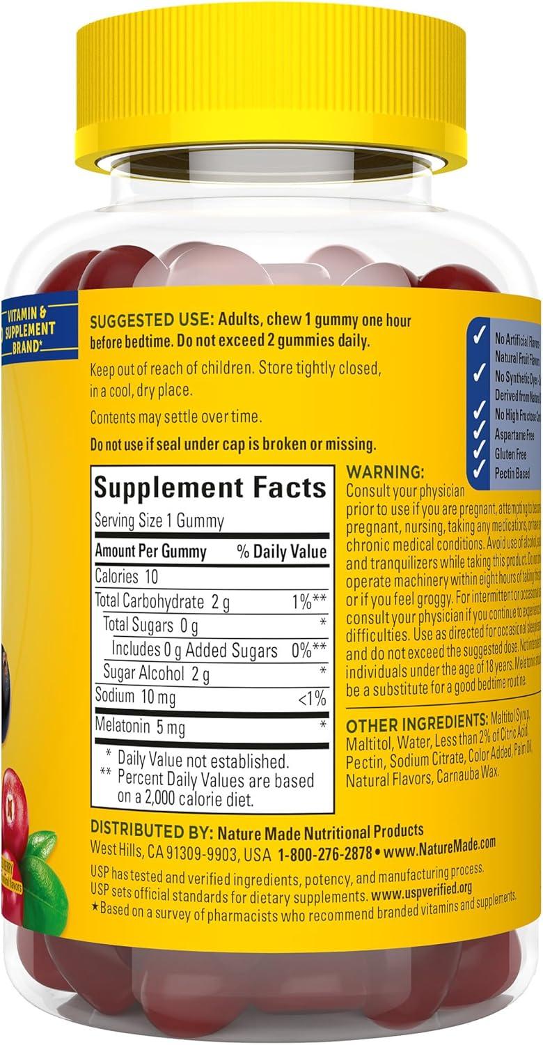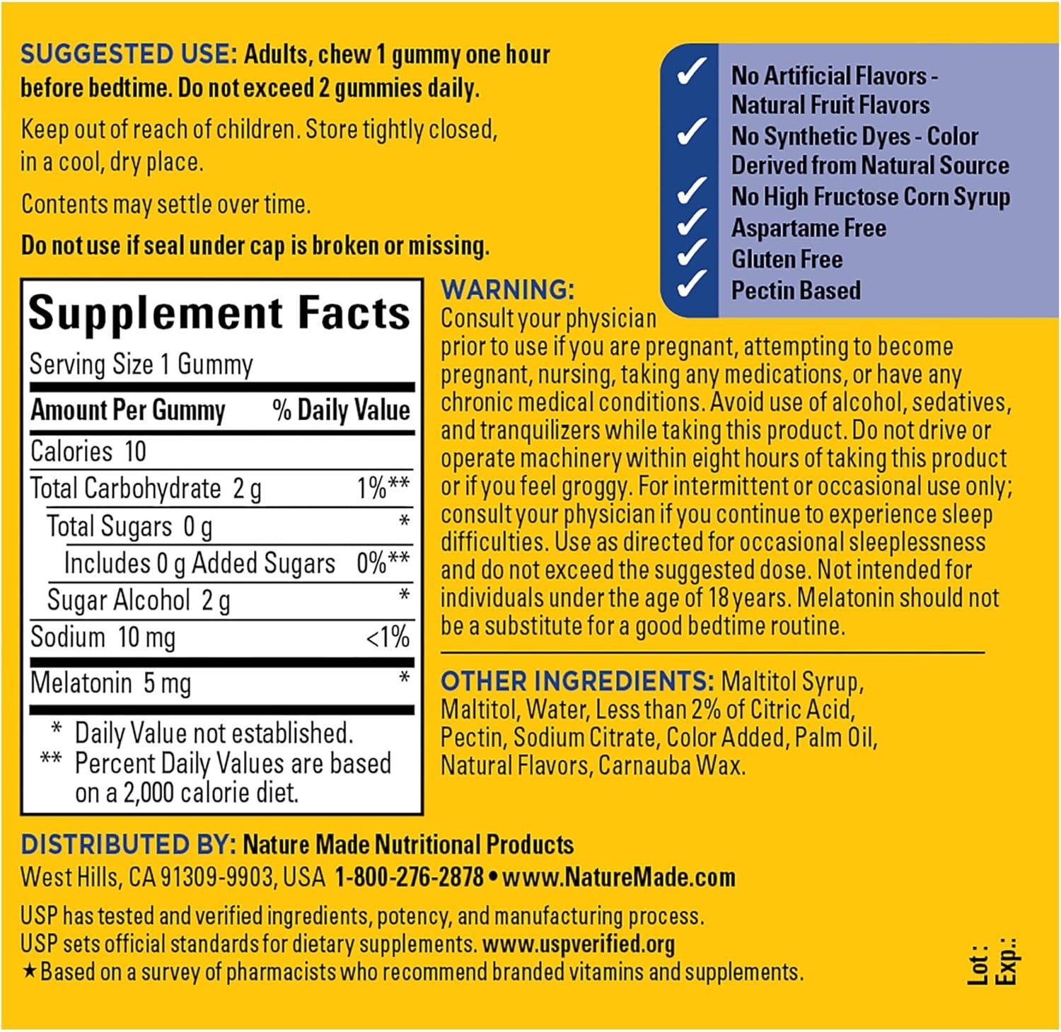 The gummies you love now with zero sugar! (1) Nature Made Zero Sugar (1) Melatonin Gummies provide Melatonin 5 mg to help you fall asleep faster and support restful sleep. These sugar free gummies provide melatonin, a hormone found naturally in the body that helps to regulate sleep and wake cycles. This 100% drug free sleep supplement is pectin based, gluten free and aspartame free with no artificial flavors, no high fructose corn syrup and no synthetic dyes – color derived from natural source. Best of all, this gummy melatonin 5mg for adults has no sugar (1) and comes in a tasty mixed berry with other natural flavors. Adults, chew 1 melatonin gummy one hour before bedtime; do not exceed 2 gummies daily. Keep out of reach of children. Store tightly closed, in a cool, dry place. With Nature Made occasional sleep aids, a good tomorrow starts tonight. (1) Not a low calorie food (2) Compared to Nature Made Melatonin Gummies. *Based on a 2024 survey of pharmacists who recommend branded vitamins and supplements. These statements have not been evaluated by the Food and Drug Administration. This product is not intended to diagnose, treat, cure, or prevent any disease.