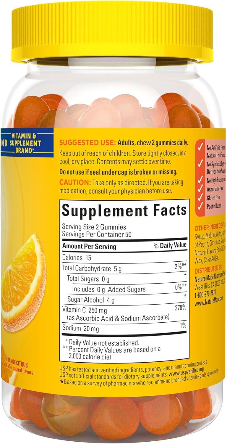 The gummy Vitamin C supplements you love have zero sugar!(1) Nature Made Zero Sugar(1) Vitamin C Gummies provide 250 mg of Vitamin C per serving. This Vitamin C sugar free supplement(1) provides an essential nutrient and antioxidant that helps support the immune system. Vit C also aids Iron absorption from food and helps make collagen for healthy skin. These chewable Vitamin C gummies for adults are pectin based, gluten free and aspartame free with no artificial flavors, no high fructose corn syrup and no synthetic dyes—color derived from natural source. Best of all, our Vitamin C sugar free gummies have no added sugar(1) and come in a tasty orange citrus flavor with other natural flavors. Start your day with a sugar free Vitamin C supplement(1) from Nature Made. This daily dietary supplement is a convenient chewable supplement enjoyed at home or on the go and fits perfectly into any supplement user’s wellness routine. *Based on a 2024 survey of pharmacists who recommend branded vitamins and supplements. USP has tested and verified ingredients, potency and manufacturing process. USP sets official standards for dietary supplements. Visit the USP verified website for more information. (1)Not a low calorie food